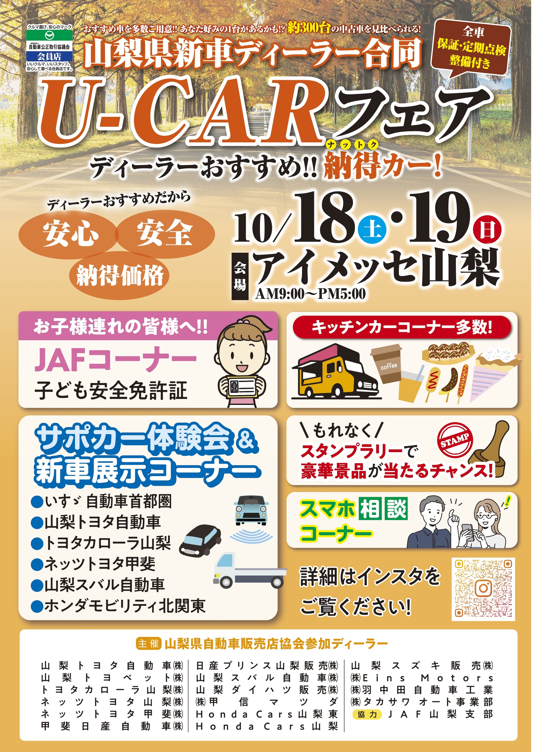 U-CARフェアのご案内 2025.10.08 甲府マイカーセンターのブログをご覧いただきありがとうございます☺ アイメッセ山梨 U-CARフェアのご案内です 安心・安全・納得価格のお車をご準備してお待ちしております!! 前の記事へ 店舗ブログ一覧に戻る 次の記事へ