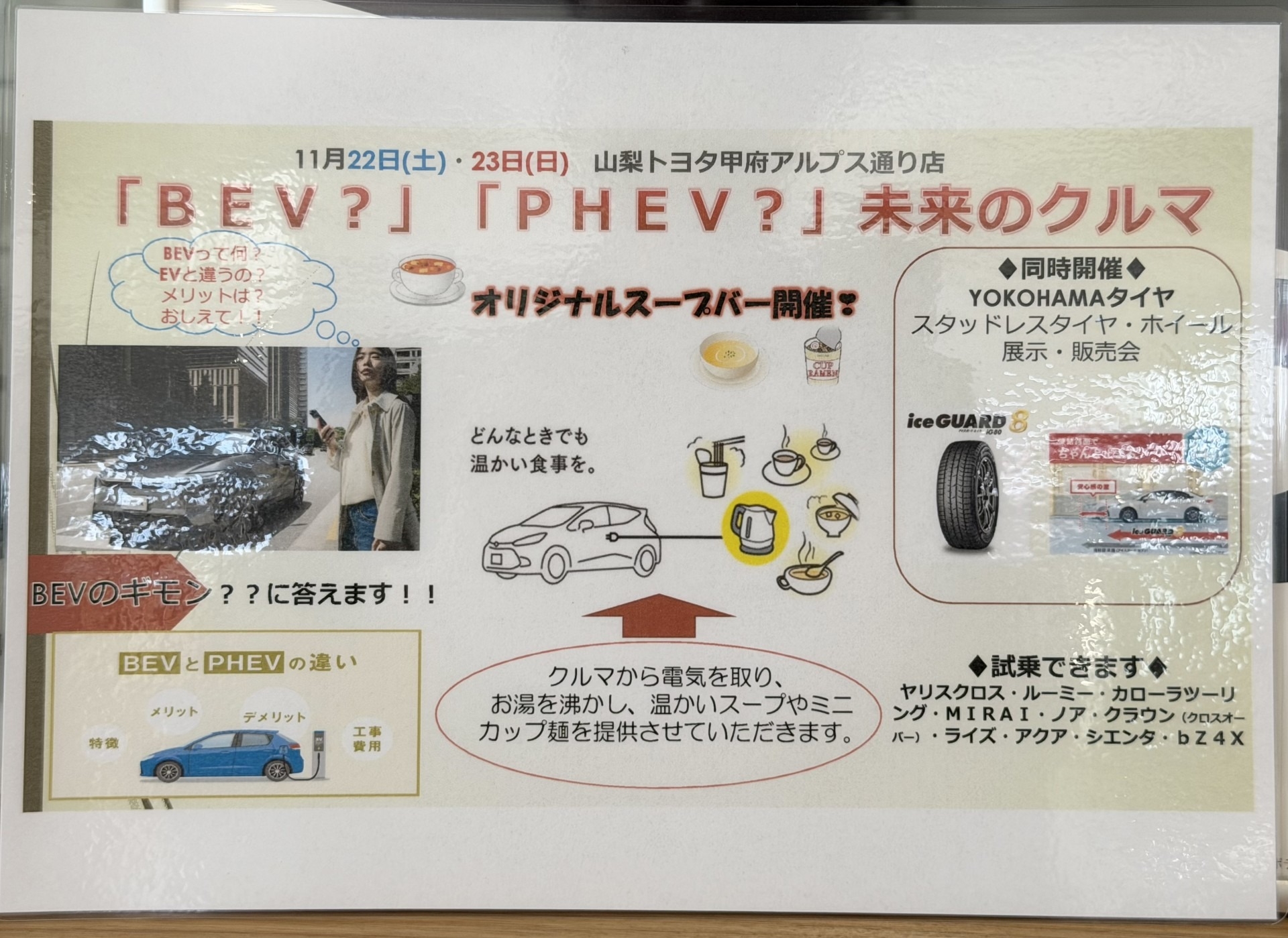PHEV車からの外部給電でお湯を沸かし、温かいスープバーやミニカップ麺を提供させていただきます☕
